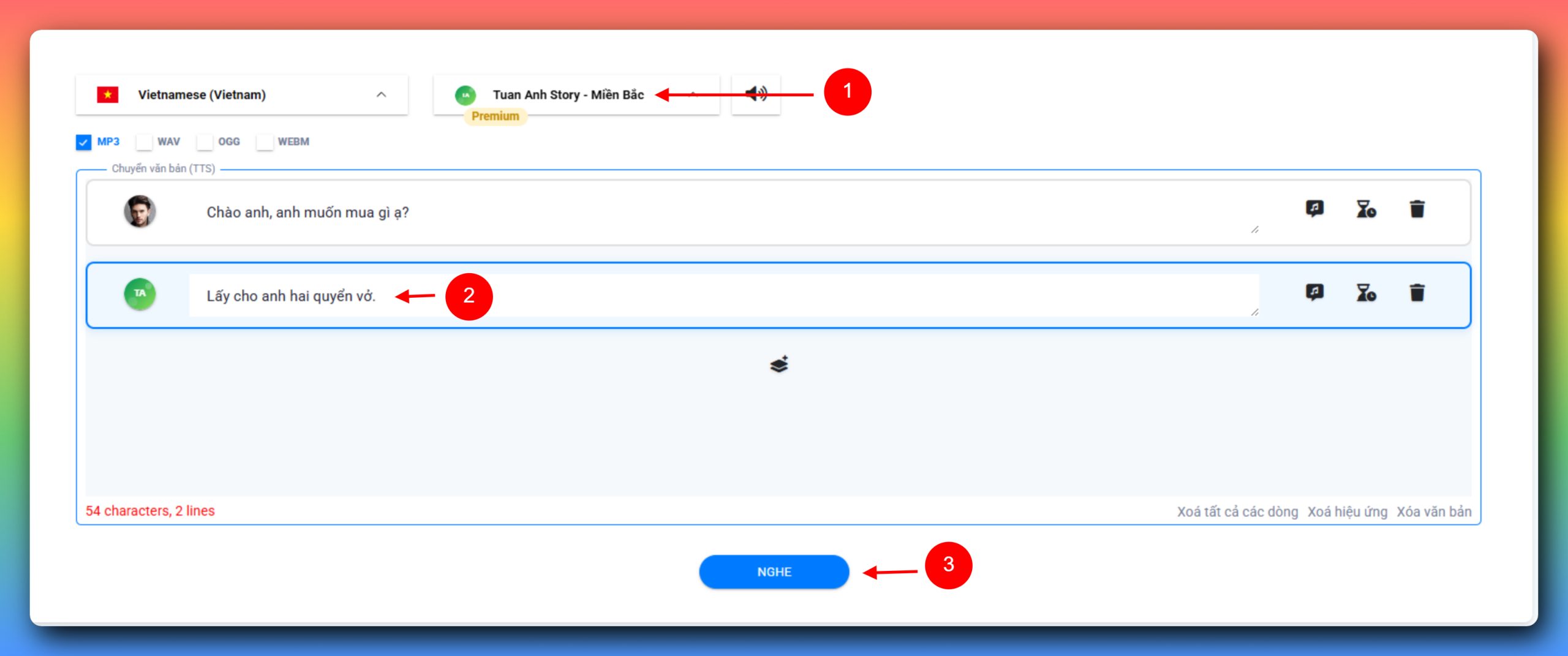 Bước 3: Nhập văn bản cho nhân vật 2. Sau đó bấm NGHE và tải về Audio hội thoại 2 nhân vật