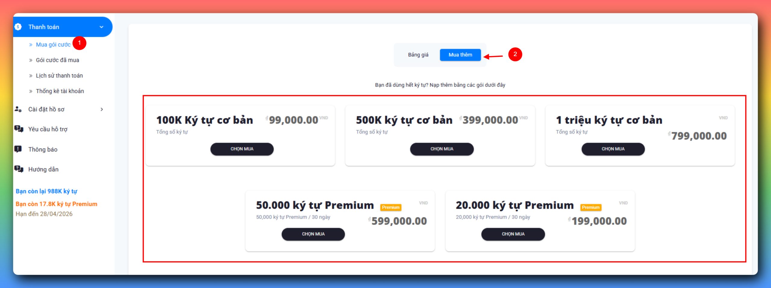Bước 6: Kiểm tra số lượng ký tự đã mua #